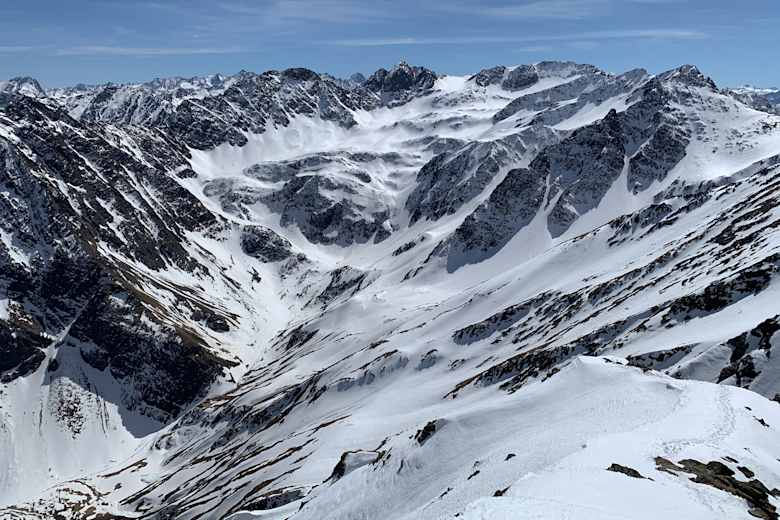 Zurück zum Skidepot und nordseitig hinab in das Finstertal. Der Einstieg an der Scharte ist steil und manchmal stark vom Wind ausgeblasen (hart). Das relativ große Kar ist an manchen Stellen über 30° steil und dreht in seinem Verlauf nach links – bleibt man immer in der Mitte des Kars, gelangt man ohne Hindernisse zum Finstertaler Stausee. Noch oberhalb des Ufers setzt man zu einer Querfahrt an, die einen möglichst weit am Ostufer des Sees entlang kommen lässt. Irgendwann reicht selbst das beste Wachs nicht mehr aus und man schiebt/brettelt, um den nötigen, geringen Höhenunterschied zu bewältigen. An der Staumauer angelangt ist man bereits im Variantenbereich des Skigebiets – üblicherweise sind Spuren in allen möglichen Geländekammern vorhanden und man tut gut daran, den letzten Teil der Abfahrt in Ruhe zu überblicken und die für sich persönlich beste Linie zu wählen. Gängig ist es, wenn man östlich der Staumauer im Bereich einer Straße abfährt und den Finstertalbach unterhalb der Staumauer nach links (W) quert. Das Gelände hinaus zu den Talstationen und Parkplätzen wird immer flacher, zuletzt fährt man der Piste entlang zum Endpunkt der Tour an der Talstation des Alpenrosenlift.