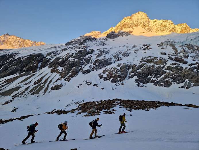 Für die Gletscherpassage unbedingt früh starten – im festen Morgenfirn macht der Aufstieg mehr Freude, und auf dem Stucklistock bleibt Zeit für eine kurze Gipfelrast mit eindrücklichem Blick über die Gletscherwelt.