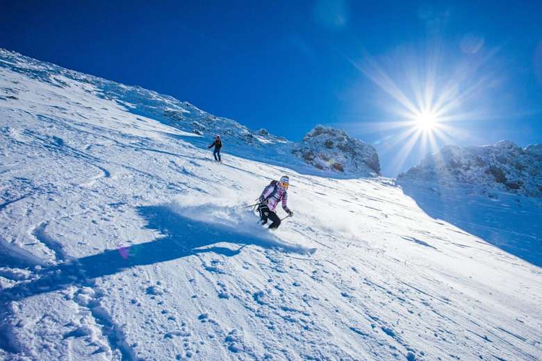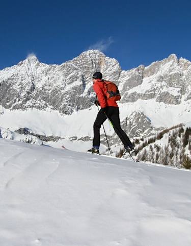 Konditionell und technisch anspruchsvolle Skitour mit Kletterpassagen auf die 2.667 m hohe Scheichenspitze im Dachsteingebirge: Von Kulm führt der anspruchsvolle Aufstieg über die Lärchenbodenalm auf den aussichtsreichen Gipfel. Nach einem kurzen Gegenanstieg sorgt die Abfahrt über das Edelgrieß für gute Laune.
