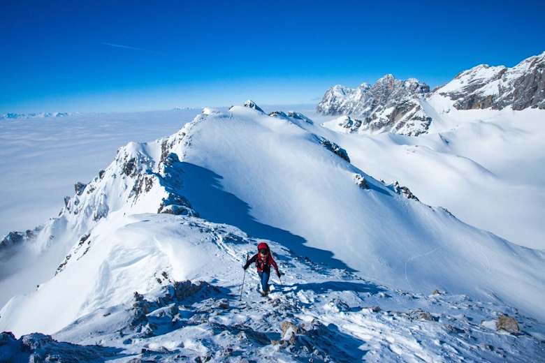 Aufstieg vom Skidepot zur Scheichenspitze über den zum Teil versicherten Grat. Foto: Schladming-Dachstein Tourismus / René Eduard Perhab