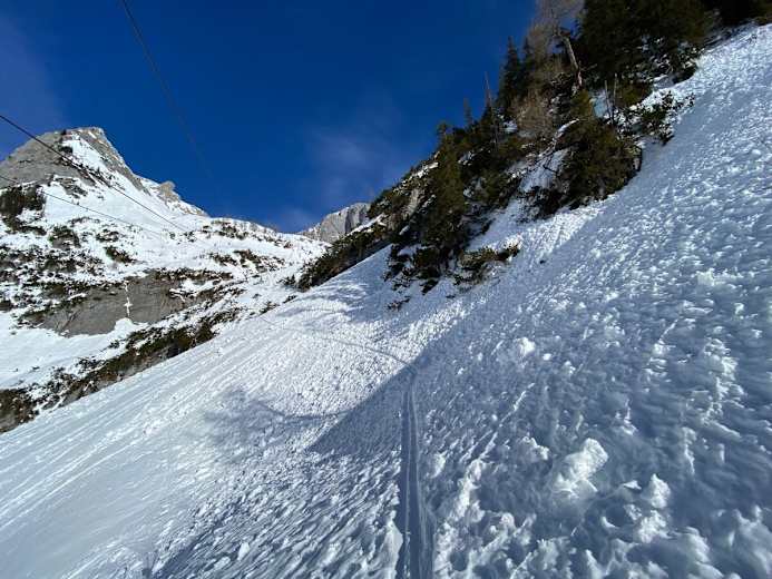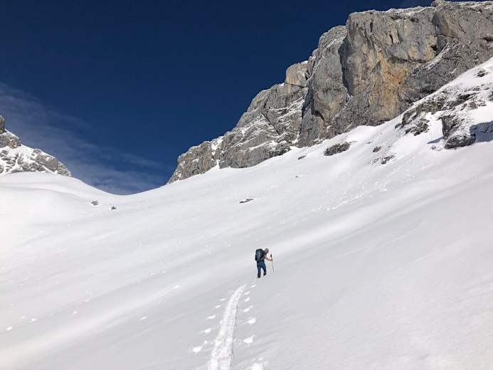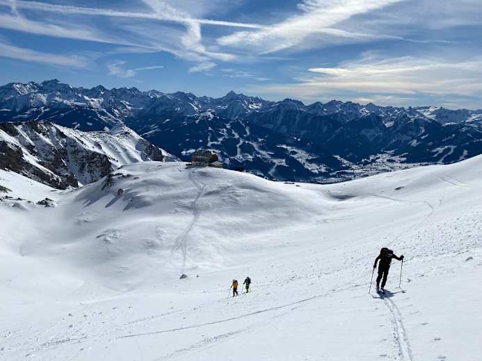 Technisch versierte Skitourengeher können bei optimalen Firnbedingungen über die steile Südflanke des Sinabell abfahren und am Wandfuß entlang ins Feisterkar queren.