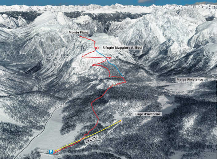 Die einfach und kurze Skitour auf den 2.324 m hohen Monte Piana in den Dolomiten bietet einige unterhaltsamen Varianten und eignet sich für Einsteiger. Ausgangspunkt ist der großen Parkplatz beim Skilift „La Loita“ bei Misurina.