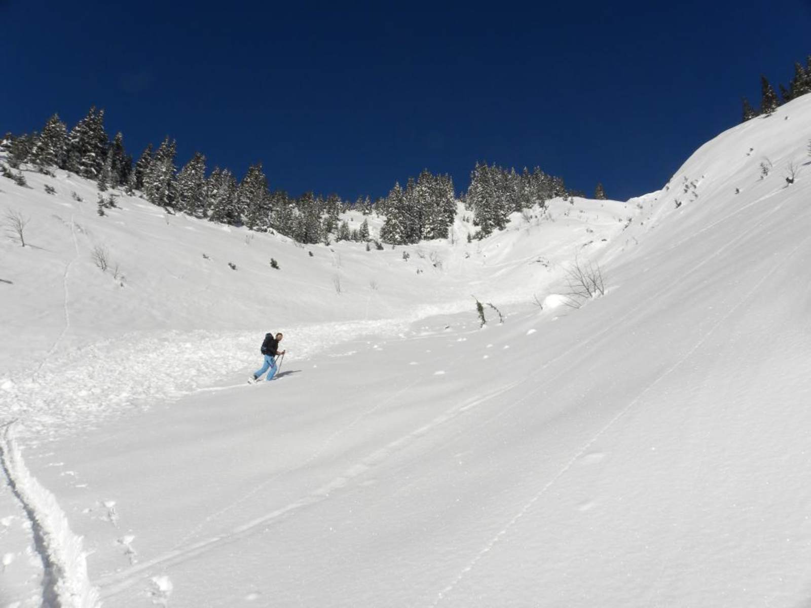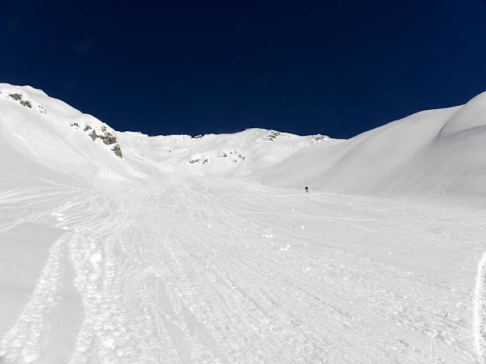 Die Abfahrt erfolgt entlang des Aufstiegweges bis hinunter zur Höttinger Alm. Entweder quert man dann hinaus zur Skipiste oder man gönnt sich noch eine Abfahrt durch den Graben bis hinunter zum Forstweg, der vom Höttinger Bild herauf kommt. Nun muss man noch einmal auffellen, um wiederum auf die Skipiste zurück zu gelangen. Bei entsprechendem Schnee bzw. generell guter Schneelage rentiert sich die Abfahrt auf jeden Fall!