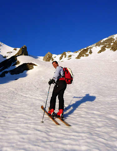 Leicht ansteigend geht es auf eine Steilstufe zu, die man entweder ganz links oder entlang des Sommerwegs überwindet. Oberhalb der Steilstufe hält man sich links und erreicht nach einer weiteren ca. 400 Hm-Geländestufe den Plangeroßferner. Flach geht es weiter zum ersten Steilaufschwung des Hängegletschers. Dieser Bereich kann spät im Frühjahr bereits kurze Blankeisstellen aufweisen. Nach einem kurzen, flachen Becken erreicht man eine ca. 35° - 40° steile Rinne neben dem oberen Teil des Hängegletschers, welche auf das oberste Gletscherbecken führt. Achtung auf Spalten! Über eine weitere steile Rinne erreicht man das Skidepot am Joch zwischen Süd- und Nordgipfel.