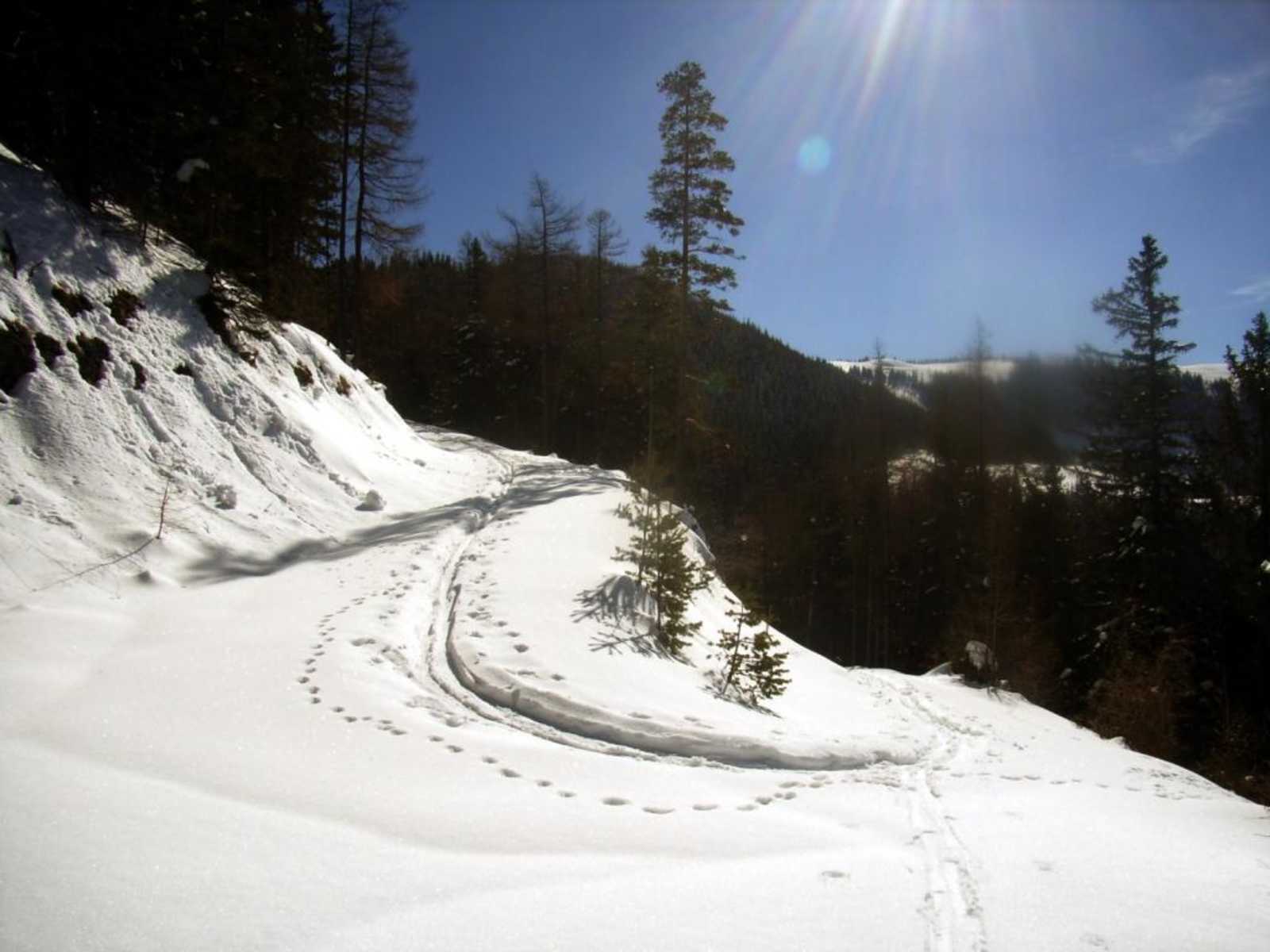 Finale Abfahrt wieder Richtung Süden über den Gipfelhang bis zu der Bergrettungshütte. Hier der Piste folgen bis zur Forststraße und diese immer entlang bis zum Ende bei einem Wohnhaus nahe der Kirche. Ab hier die Ski tragend ca. 600 m zurück zum Auto.