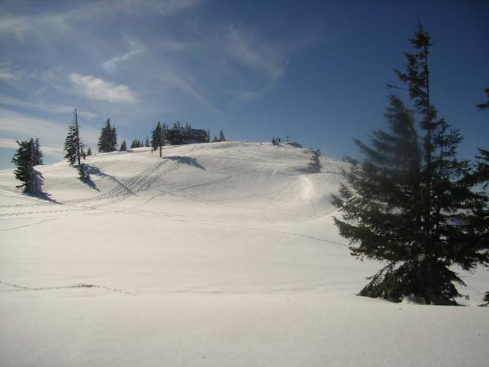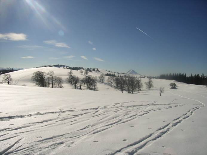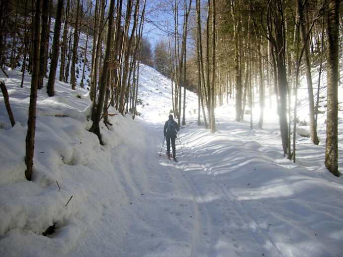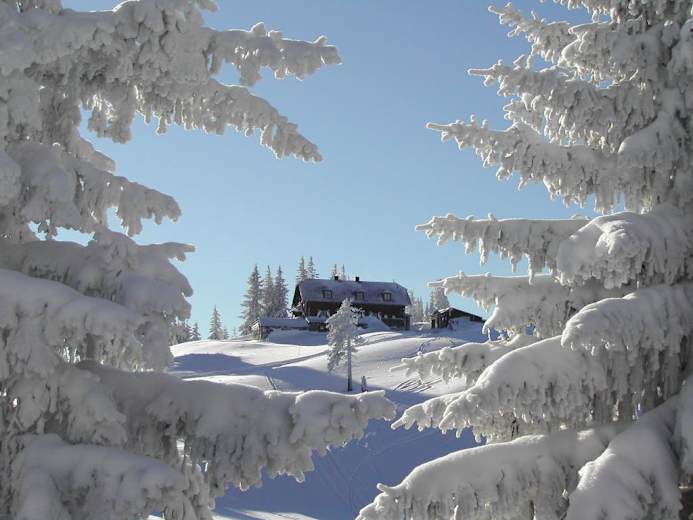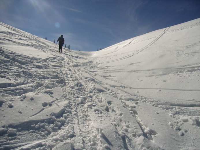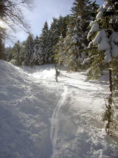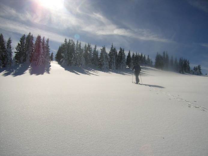 Wie beim Aufstieg zurück zur Kuppe auf 1.339 m und von dort weiter nach Nord-Ost zu zwei kleinen Almhütten (Kalte Kuchl). Vorbei an einem Gedenkkreuz zu einer unscheinbaren Kuppe auf 1.305 m, wo dann die Felle endlich im Rucksack versorgt werden können und die Abfahrt beginnen kann. Über schöne Hänge und durch ein kurzes Waldstück bis zu einer Holzhütte auf ca. 930 m. Ab hier auf der Forststraße (Kehren) in gemütlicher Abfahrt zurück zum Tortalhof. Bei wirklich guten Schneeverhältnissen sind hier auch Direktvarianten durch den lichten Wald möglich.