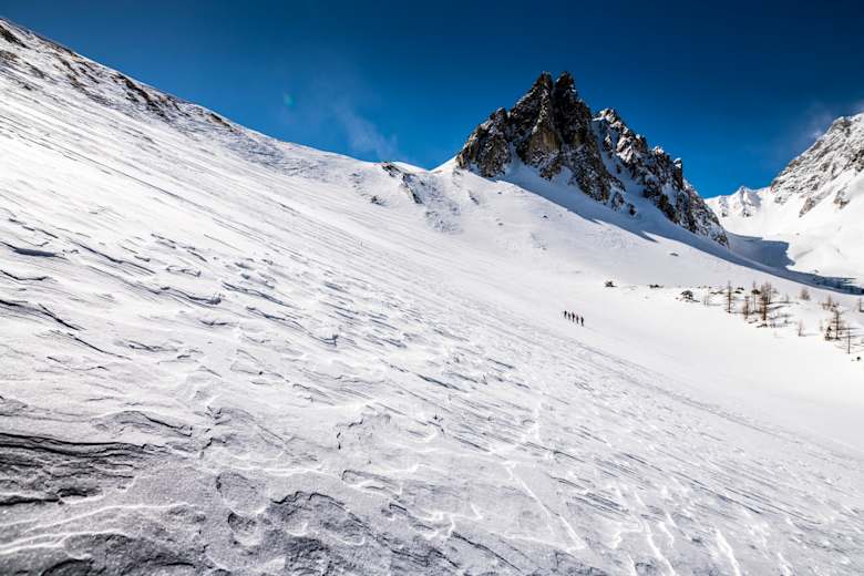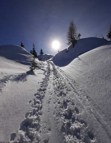 Diese Skitour eignet sich für die Abfahrt mit dem mitgeführten Snowboard, da keine Flachstücke und Gegenanstiege überwunden werden müssen.