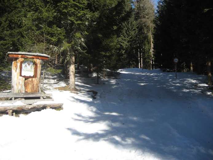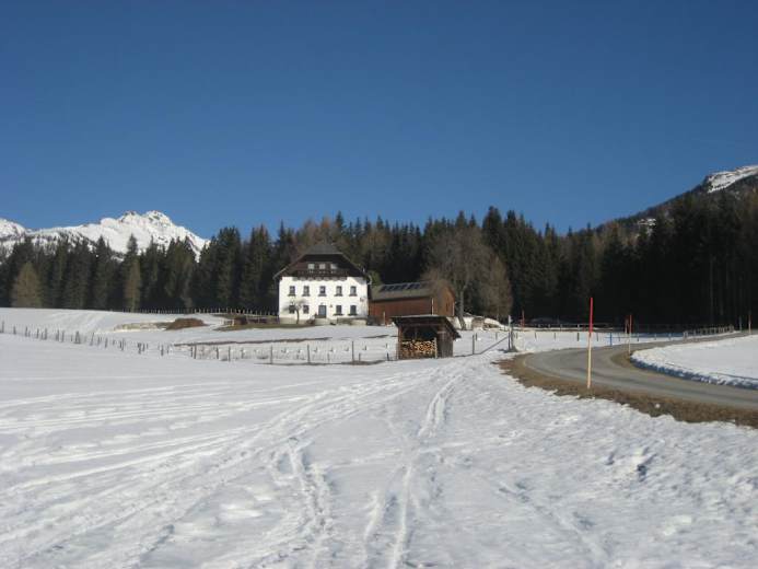 Gleich vom Parkplatz startet die Tour über die Wiese sanft ansteigend zum „Platsch“ - einem Bauernhof mit einem weißen Haupthaus. Dort kann man evtl. auch den PKW parken um alternativ erst von dort die Tour zu beginnen. Auf dem Weg zum Platsch quert man die Straße nach Lignitz und die Langlaufloipe.