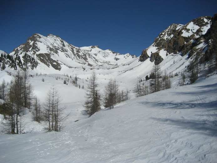Versierte Skifahrer können bei sicheren Verhältnissen eine direkte Abfahrtsvariante in den Karboden wählen.