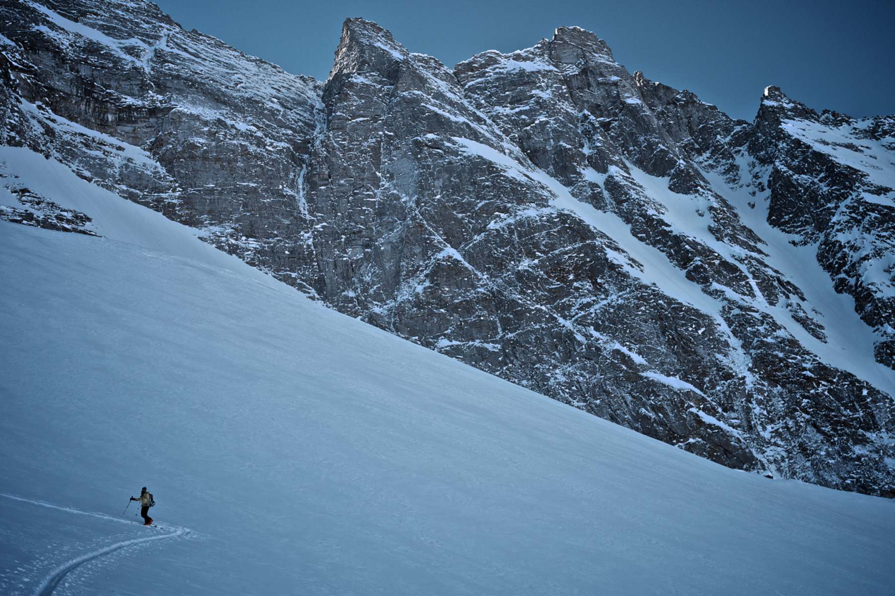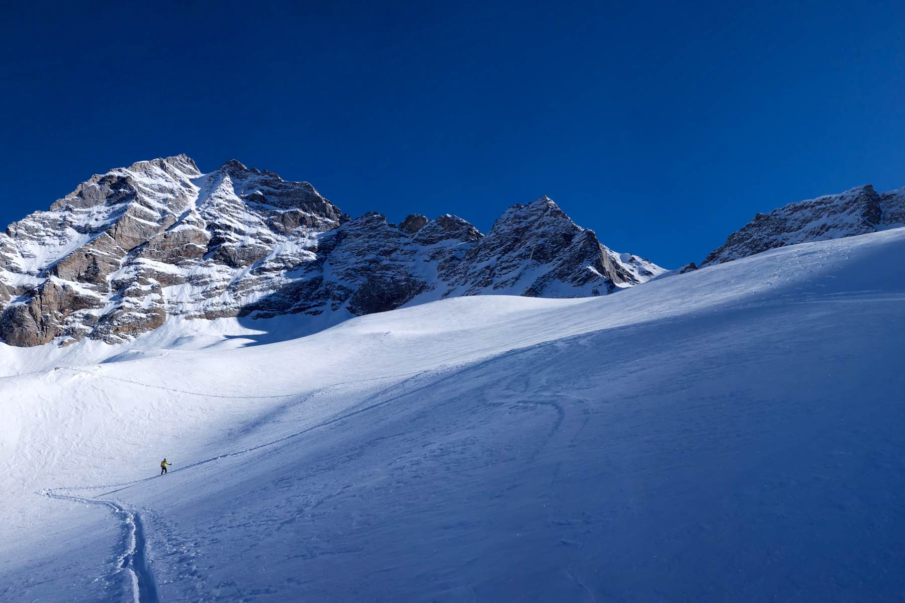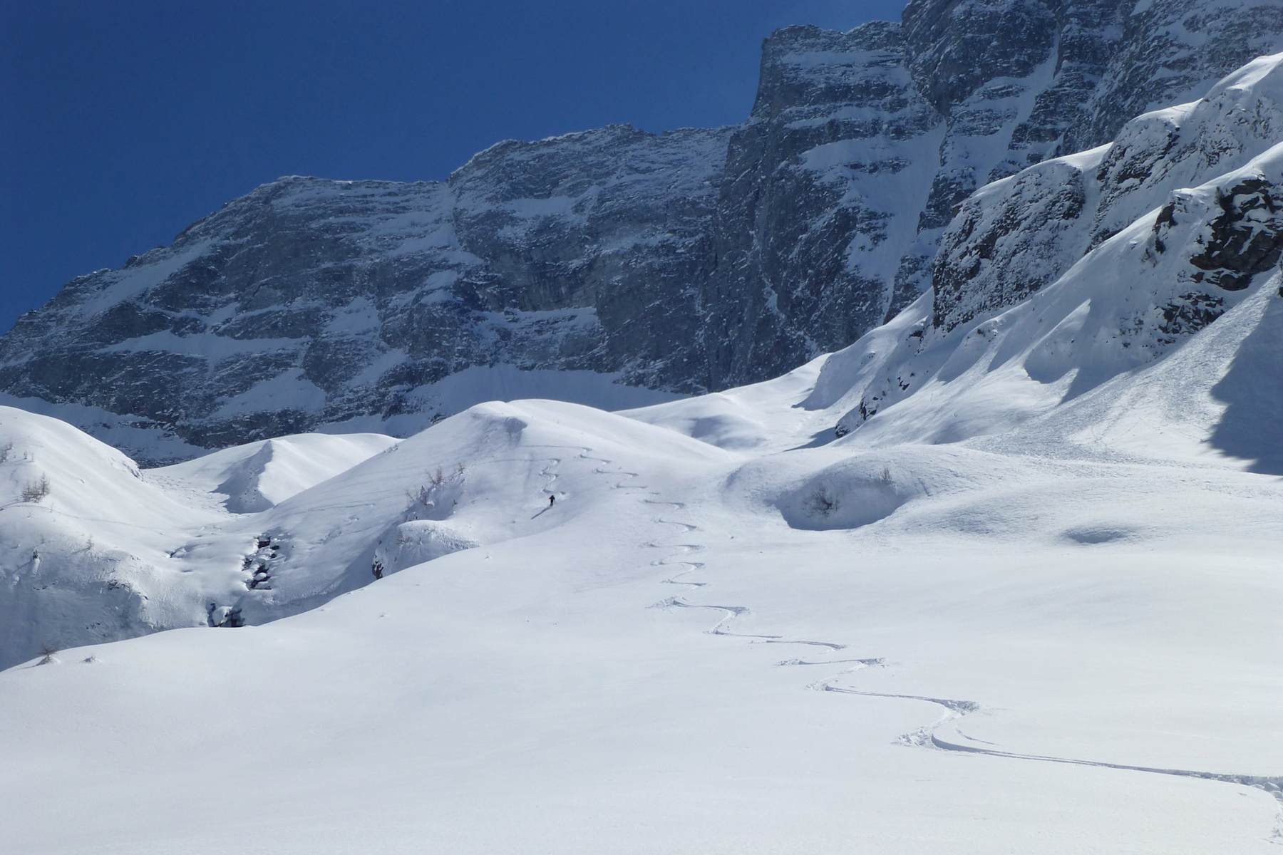 Die Abfahrt erfolgt im Bereich der Aufstiegsspur, wobei je nach Verhältnissen eine gute Auswahl an Varianten möglich ist. Hin zu den Nordwänden findet sich oft lang guter Pulver, während die mehr sonnenexponierten Hänge im Frühjahr oft schon auffirnen.