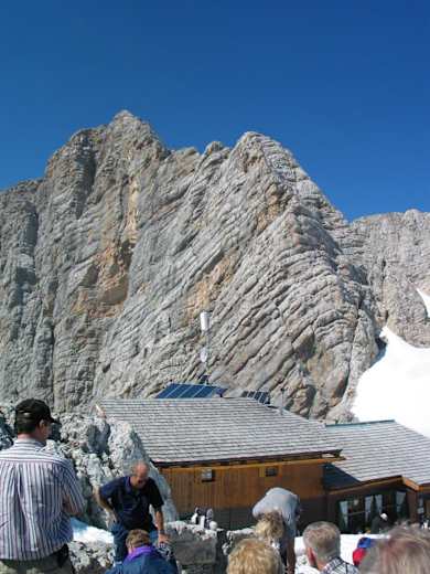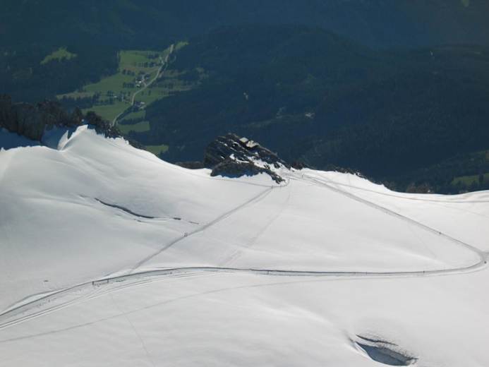 Als Variante kann man die Spur vom Dirndl-Kolk hinunter zur unteren Felsnase des Eissteins wählen. Vom Eisstein geht es über die mittlere Zunge des Hallstätter Gletschers direkt hinunter zum oberen Eissee. Von hier muss man ca. 200 Hm zur Simonyhütte aufsteigen. Freie, sanfte Gletscherhänge führen hinab zur Simonyhütte (2.203 m).