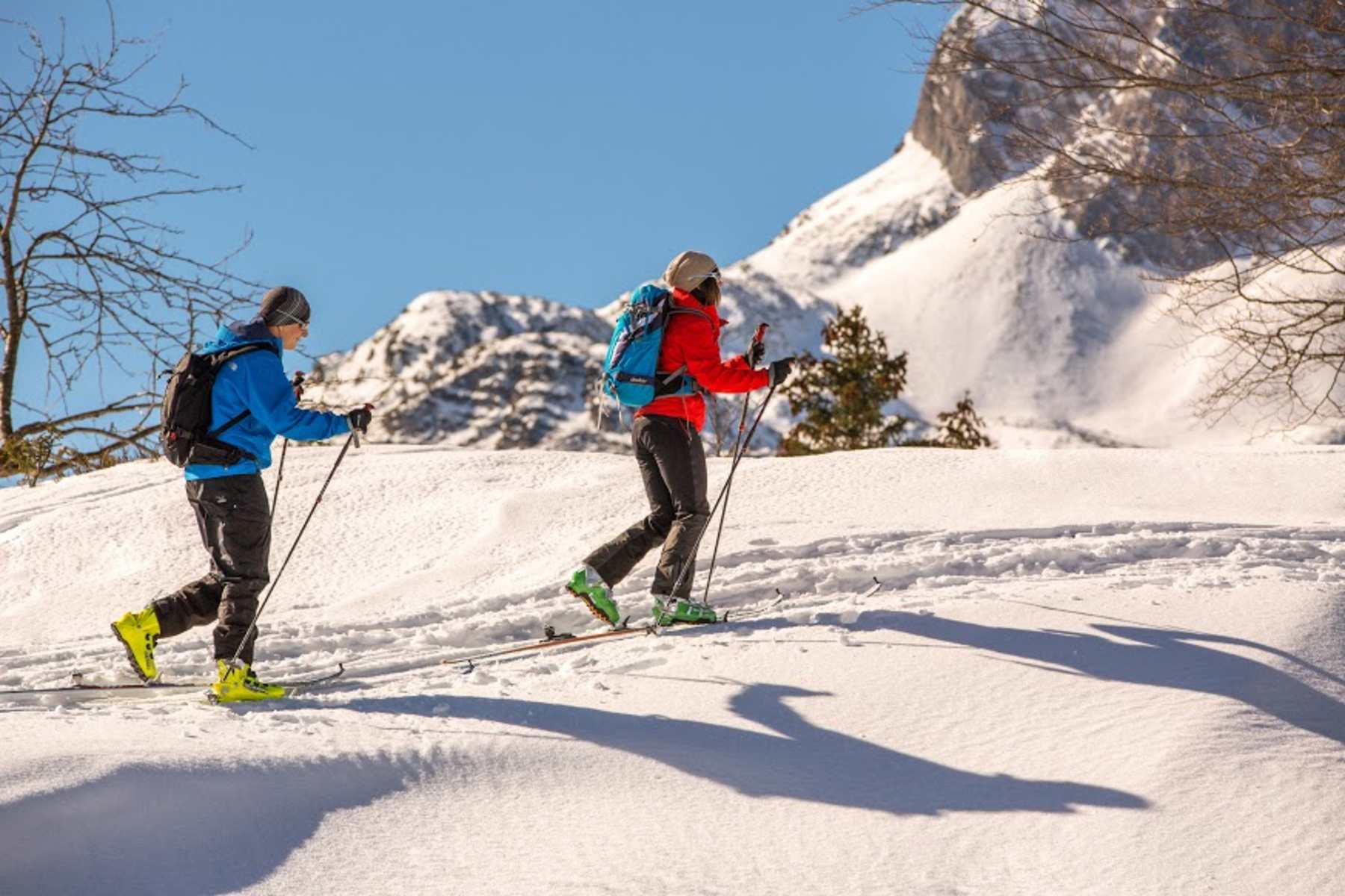 Links der Eckbauer-Talstation beginnt der Skitourenpfad – hier befindet sich auch ein LVS-Checkpoint. Die Tour startet gleich mal steil bergauf an der Skischanze entlang. Unter der Eckbauerbahn hindurch spurt man abwechselnd mal im flachen, mal im steilen Gelände um den Eselsberg herum und erneut unter den Bahn hindurch. Das Ziel, der Berggasthof Eckbauer (1.236m), liegt rechts der Bergstation.
