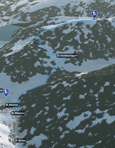 Los geht es entspannt flach am Zwergerllift entlang. Doch kaum führt die Piste um die Kurve wird klar: Jetzt werden Höhenmeter gesammelt. Es geht am Pistenrand steil bergan. Meist führen hier auch Spuren in den Wald hinein, wo man dann in Ruhe seine Spitzkehren machen kann ohne Skifahrern in die Quere zu kommen. Nach 400 Hm hat man schon knapp die Hälfte der Höhe geschafft und wird mit der Abzweigung nach links belohnt: Es wird flach und es geht weg von der Piste und hinein in den Wald. Die Route ist vom DAV ausgeschildert und mit großer Sicherheit auch gespurt.