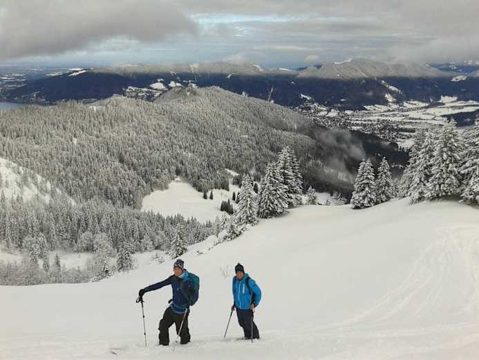 Der Hirschberg (1.670 m) ist das wohl beliebteste Skitourenziel am Tegernsee in den Voralpen Bayerns. Das liegt auch daran, dass der untere Teil recht schneesicher ist, da es auf der Piste losgeht. Bei den Hirschbergliften handelt es sich um eine kleine, ursprüngliche Anlage aus nur wenigen Schleppern. So hält sich der Trubel hier wunderbar in Grenzen. Die Piste verlässt der Skitourengeher auf halber Strecke und der zweite Teil verläuft dann im Abseits.