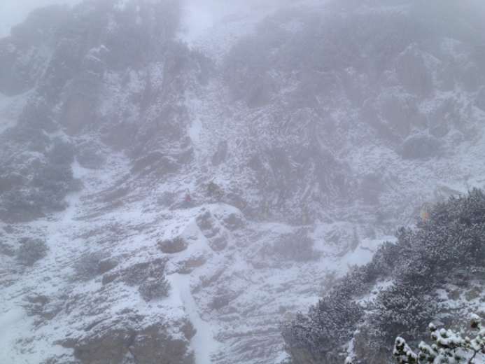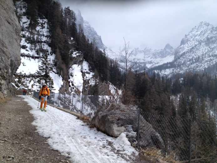 Start ist in Tuffbad. Bei eher schlechten Schneebedingungen muss man damit rechnen, dass man die Ski knapp 1.000 Hm auf dem Rücken tragen muss. Auf einem steilen Steig geht es zum Zochenpass. Schließlich kann man die Profoils anlegen und das Tempo ein wenig erhöhen. Schon kann man das Ziel, das Kerschbaumertörl, sehen. Nochmal 1 h mit den Skiern an den Füßen aufsteigen.
