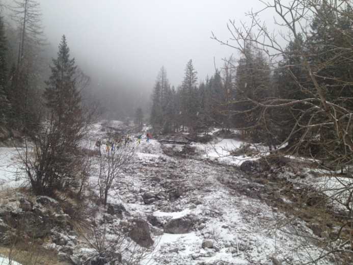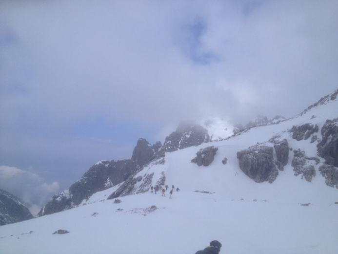 Am Törl liegt die Belohnung bereits vor Augen: Die Abfahrt zur Dolomiten Hütte. Im teilweise über 40° steilen Gelände geht es bei oftmals schweren Bedingungen die ersten 200 Hm hinunter. Jetzt noch durchs Tal zur Hütte hinausfahren und nach 6 h Skitour ein warmes Mittagessen genießen.