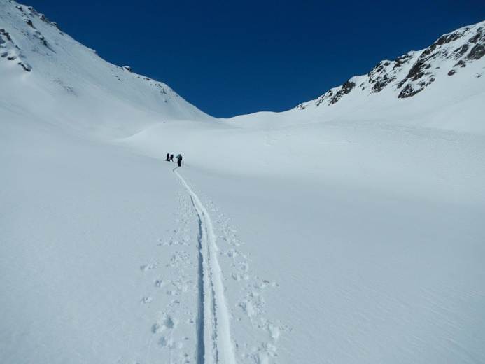 Die Spur führt nun über einen weiteren steilen Hang aufwärts, bevor es über ein schönes Muldensystem in die flache Ragötzl Lenke (2.500 m) geht (2,5 bis 3 Stunden vom Auto). Über die südwestseitigen Hänge in ca. 45 Minuten zum Gipfelkreuz.