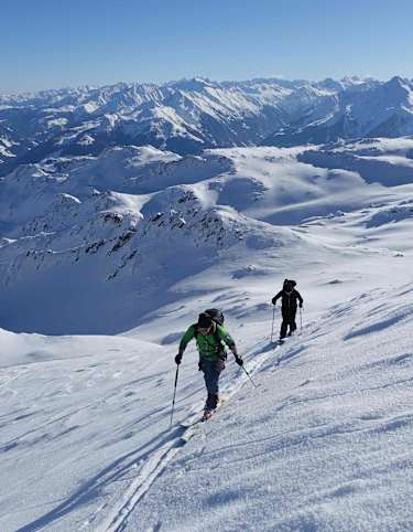 Bei sicherer und ausreichend hoher Schneelage findet sich in der breiten West- und Südwestflanke viel Platz für eigene Spuren. Ab der Nonsalm folgt man der Anstiegsroute zurück nach Innerst.