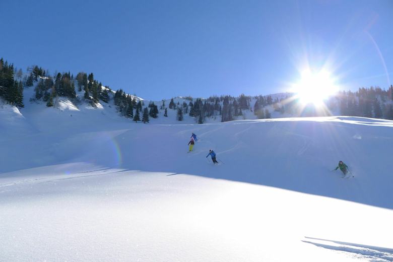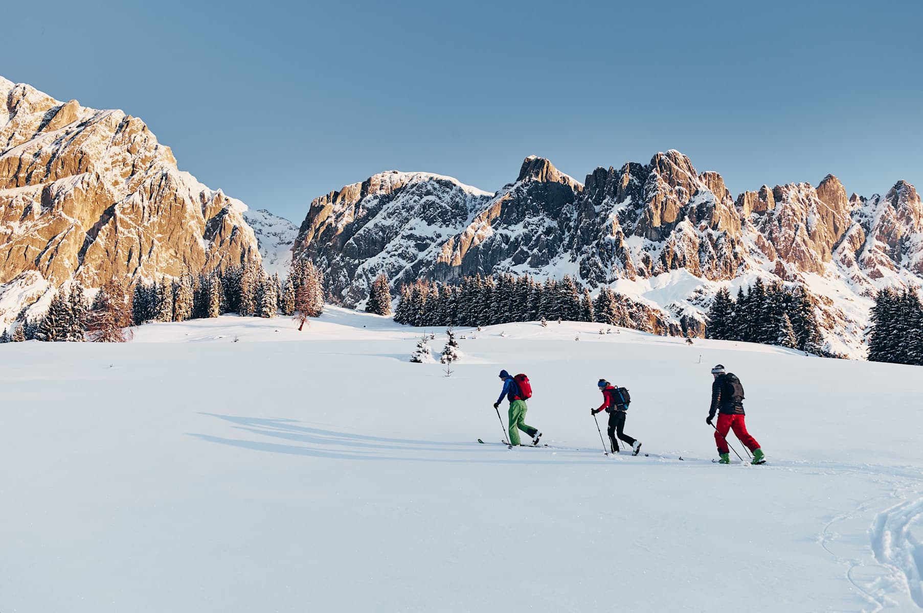 Aufstieg vom Arthurhaus in Mühlbach am Hochkönig über die "Sonnseite" zum Fuße der Vierrinnenköpfe (1.950 m). Eine erlebnisreiche Skitour auch für weniger erfahrene Skitourengeher in den Berchtesgadener Alpen im Salzburger Land.
