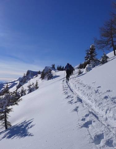 Eine kurze, sonnseitige Skitour unterhalb der Mandlwände mit prächtiger Aussicht und schöner Geländeentwicklung. Wegen des geringen Höhenunterschiedes (ca. 600 Hm) und der günstigen Exposition (S - S0) ist diese Skitour auch für weniger erfahrene Skialpinisten ein lohnendes Ziel. Nach oben hin immer steiler werdend, maximale Steilheit ca. 35°, zu beachten ist die starke Sonneneinstrahlung und die dadurch entstehenden Schneeverhältnisse. Ideale Frühjahrs Tour bei zeitigem Aufbruch.
