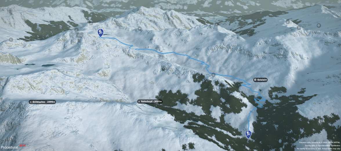 Vom Ausgangspunkt bei den Geiselhöfen steigt man zuerst je nach Schneelage über die freien Wiesen Hänge oder gleich die Forststraße nützend zur Geiselalm auf. Mit einer kleinen Abfahrt gelangt man zur Hobalm über kleinere Hänge setzt nun der Forststraße folgend die Querung zur Vallruckalm bis man über das Eiskarjoch direkt zur Torspitze aufsteigt.