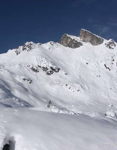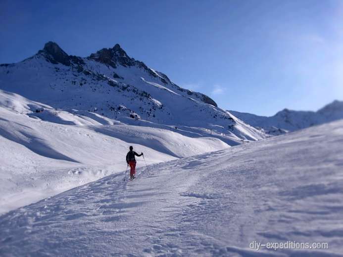Sollte die Straßenverbindung zwischen Lech und Warth bereits für den Winter gesperrt sein, dann bietet sich für alle, die in Lech ihr Quartier aufgeschlagen haben, der Zustieg über Oberlech an. Auch hier: entweder mit dem Sessellift in Richtung Petersboden fahren oder per Ski aufsteigen, dann leicht schräg aufwärts zum Ost-Grat der Juppenspitze queren.