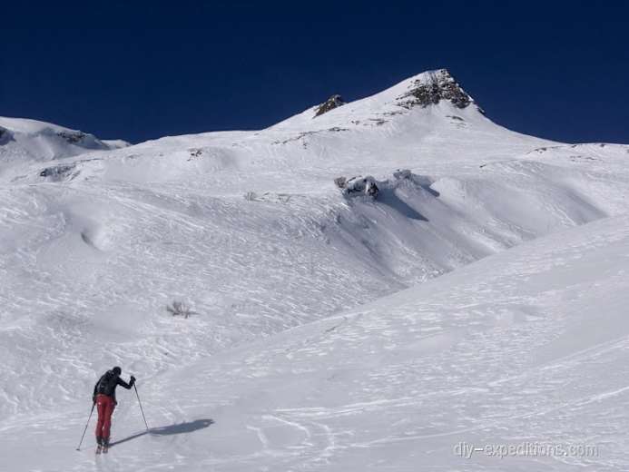 Und es ist das einzige Flachstück der Tour: Es folgt der jungen Bregenzer Ach leicht aufwärts gegen den Talsschluss nach Süden. Dort verlässt man die Pistenlandschaft und dreht fast 180° gegen Norden, um südostseitig auf die Juppenspitze in vielen Kehren aufzusteigen. Die Wegfindung hinauf ist einfach und der Routenverlauf ändert sich, fast wie immer, mit den Verhältnissen.