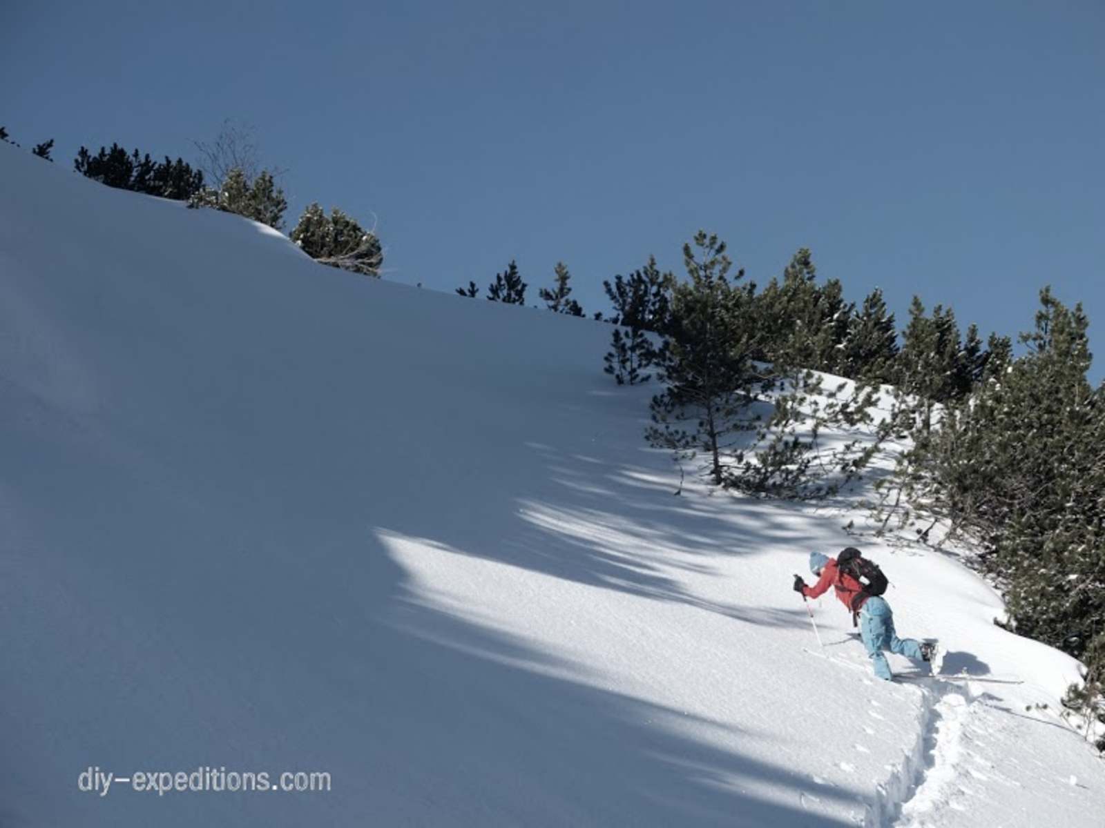 Hier gibt es viele Varianten, da muss man sich einfach seinen Weg selbst suchen. Ziel ist es jedenfalls, über die vielen kleinen Felsrippen auf eine schräge Hochebene zu gelangen, die man leicht entlang fahren kann. Der Aufstieg durch diese erste Steilstufe ist hin und wieder mit Tragen der Ski verbunden, je nach dem, welchen Weg man gewählt hat und wie dicht Latschen den Weg versperren.