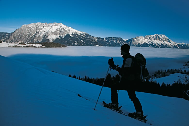 Schattengestalt – mit Sehnsucht blickt der frierende Skitourengeher auf die sonnige Kammspitze (links) und den Grimming (rechts). Über dem Ennstal liegt eine dicke Nebeldecke.Foto: Uwe Grinzinger