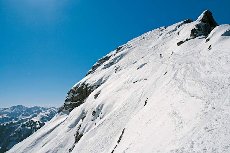 Der ausgesetzte Gipfelkamm ist nur bei optimalen Verhältnissen mit Skiern zu bewältigen, unter Umständen sind hier auch Steigeisen für den Aufstieg nötig.