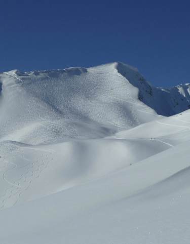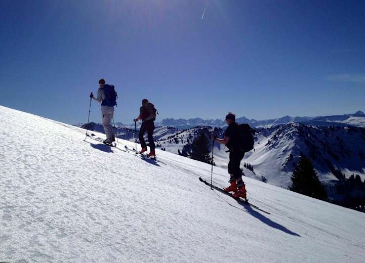 Erneut geht es hinauf - dieses Mal in Richtung Buralpkopf (1.772 m) und einige Höhenmeter unterhalb des Grates dann talwärts bis zur Gatter Alpe auf 1.489 m. Wieder mit Fellen unter den Skiern in östlicher Richtung die letzte längere Steigung hinauf zum Sedererstuiben (1.737 m). Die Abfahrt führt diesmal nordseitig über einen freien Hang, auch "Märchenwiese" genannt.