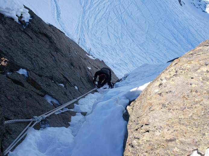Zunächst heißt es aber, fast 150 Hm auf den kleinen Kaltenberggletscher abzufahren. Nun beginnt der letzte Abschnitt des Aufstiegs, eine 400 m sich aufsteilende Flanke kurz unter dem Gipfel. Die Verhältnisse müssen hier sehr sicher sein. In vielen Spitzkehren geht es Meter für Meter hinauf, um am Gipfelfels das Skidepot einzurichten.