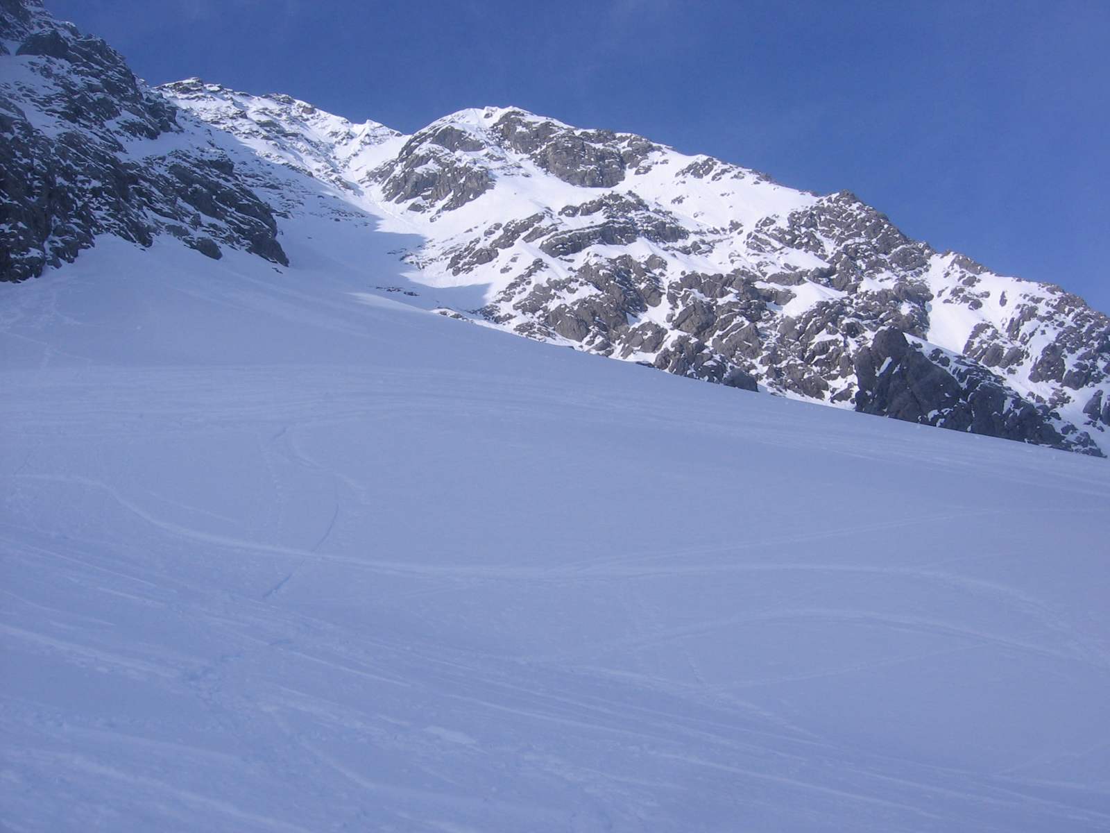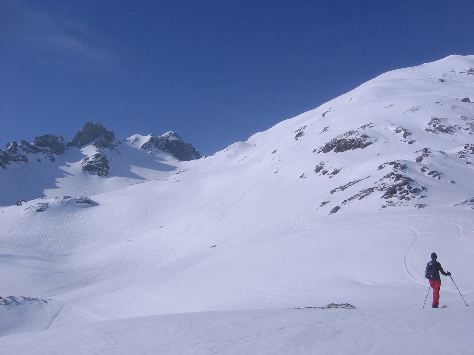 Egal für welchen man sich entscheidet, nach etwa 30 Minuten kommt man am ersten Steilhang vorbei: der Nordhang in die kleine Hochebene der Schafberge. Den Einstieg in diesen Hang kann man nicht verpassen. Davor sind nur felsige Steilwände, die das Lechtal im Süden begrenzen. Doch plötzlich senkt sich die Wand nach hinten und ein gewaltiger Hang eröffnet sich. Im Sommer ein Geröllhang, im Winter aber eine Prachtabfahrt.