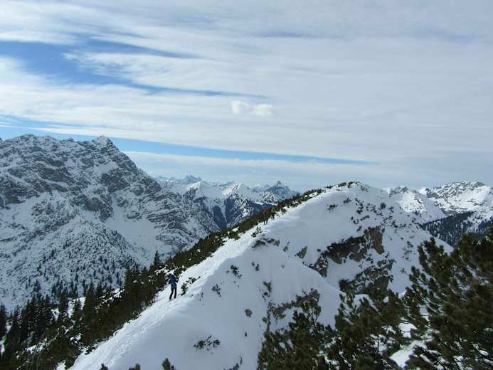 Anspruchsvolle Skitour in der Zugspitzregion in Bayern für sichere und geübte Tourengeher. Die Kondition und Technik fordernde Tour auf die Kreuzspitze (2.184 m) mit Gipfelblick auf Wetterstein und Lechtaler Alpen gehört zu den beliebtesten Skitouren in den Ammergauer Alpen.