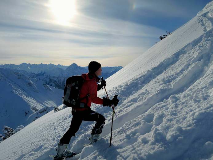 Mittelschwere Skitour im Allgäu in Bayern. Ziel der Tour ist der Ochsenälpeleskopf (1.905 m) an der deutsch-österreichischen Grenze. Gute Schneeverhältnisse und technisches Fahrkönnen sind Voraussetzung für diese eher seltener begangene Tour in den Ammergauer Alpen.