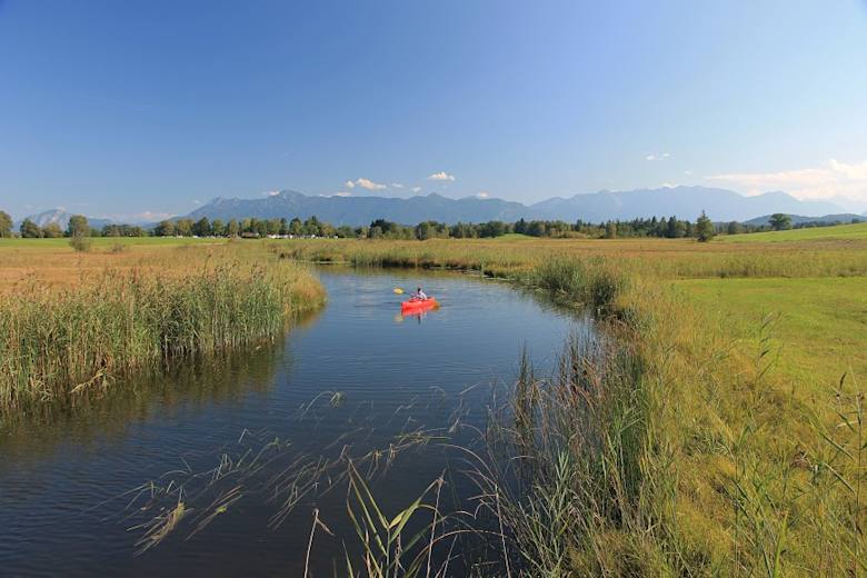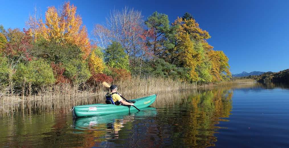 Paddlers Paradies im Blauen Land: Der Staffelsee im Malerparadies „Blaues Land“ ist eine gute Wahl für Kanuten, die das Schöne lieben. „Blaues Land“ ist heute eine Bezeichnung für das oberbayerische Alpenvorland zwischen Staffelsee und Zugspitze. Nicht nur die vielen Seen und Gewässer geben der Region ihren Namen, oft bilden auch die nahen Gipfel der bayerischen Alpen am Horizont ein bläuliches Panorama im dunstigen Licht. Die Gegend war Zentrum der Künstlergruppe „Blaue Reiter“, die Anfang des 20. Jahrhunderts hier unvergessliche Werke geschaffen hat. „Blau ist die einzige Farbe bei der ich mich wohl fühle“ sagte der Maler Franz Marc. Paddler, die sich hier auf die Suche nach der Farbe Blau begeben, werden sie in allen Schattierungen vorfinden. Lohnende Kanutour in Bayern.