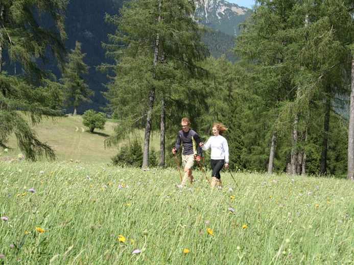 Mittelschwere Nordic-Walking-Strecke in der Mieminger Kette in der Region Innsbruck in Tirol: Auf dieser Tour geht es in einer Schleife durch Obsteig. Eine Runde die sich optimal zum Erkunden der Gegend anbietet.