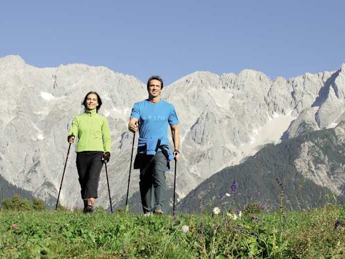 Mittelschwere Nordic-Walking-Strecke in der Region Innsbruck in Tirol: Über knapp 10 km geht es auf dieser Tour von Mooswiesen in einer Schleife durch die Ausläufer der Mieminger Kette. Eine hervorragende Trainingsstrecke mit sehr abwechslungsreichem Gelände und einem unvergleichlichen Ausblick auf das Hochplateau.