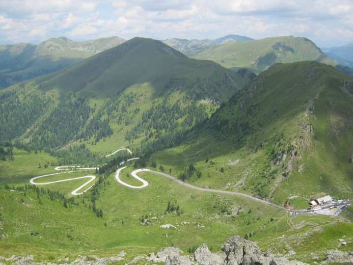 Nach der stetig steil ansteigenden Nockalmstraße folgt der nächste Aufstieg über viele Kehren bis zur Glockenhütte (2.024 m)