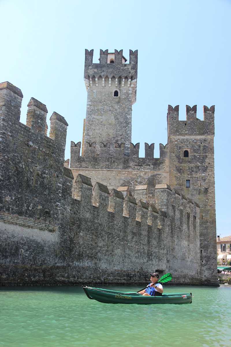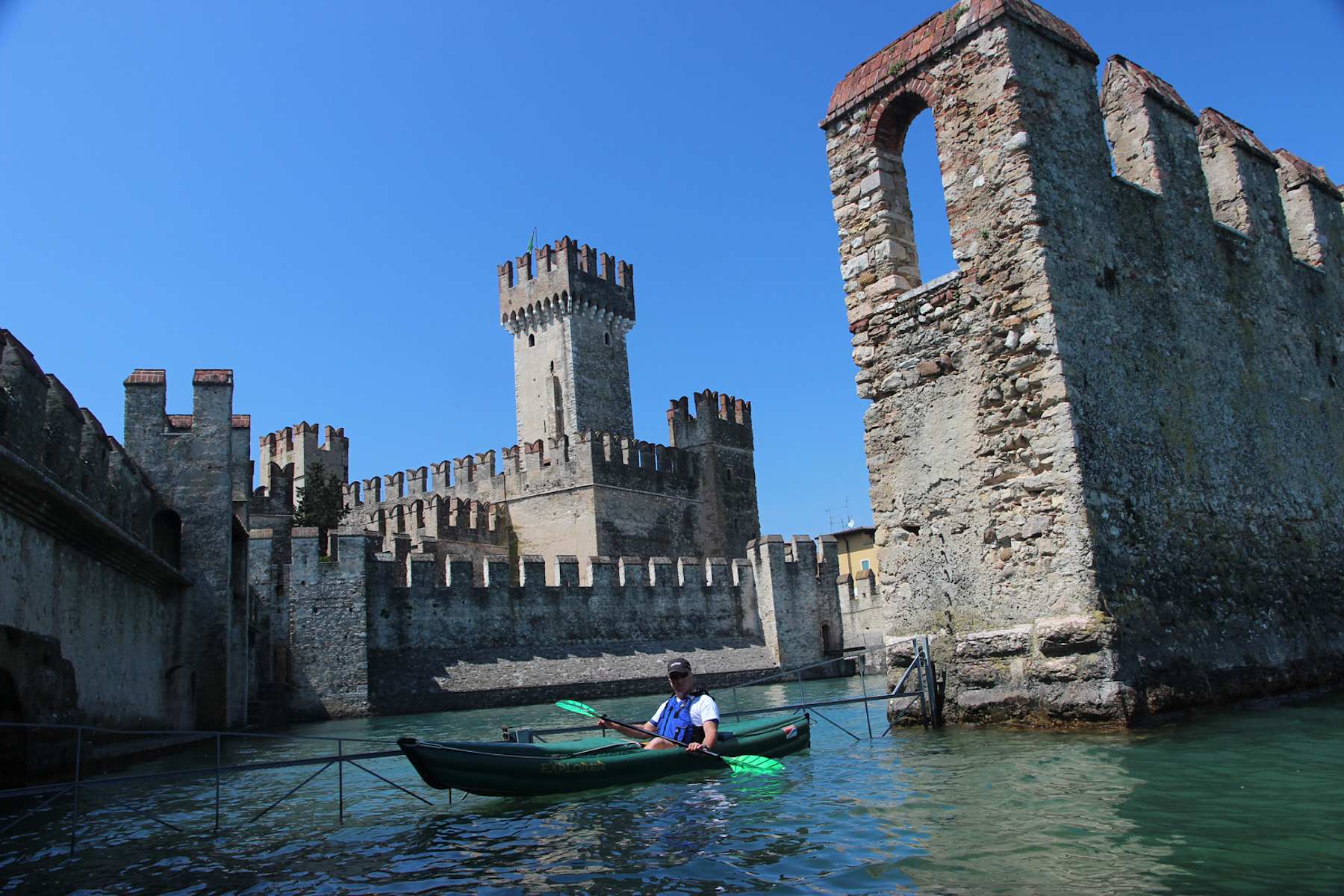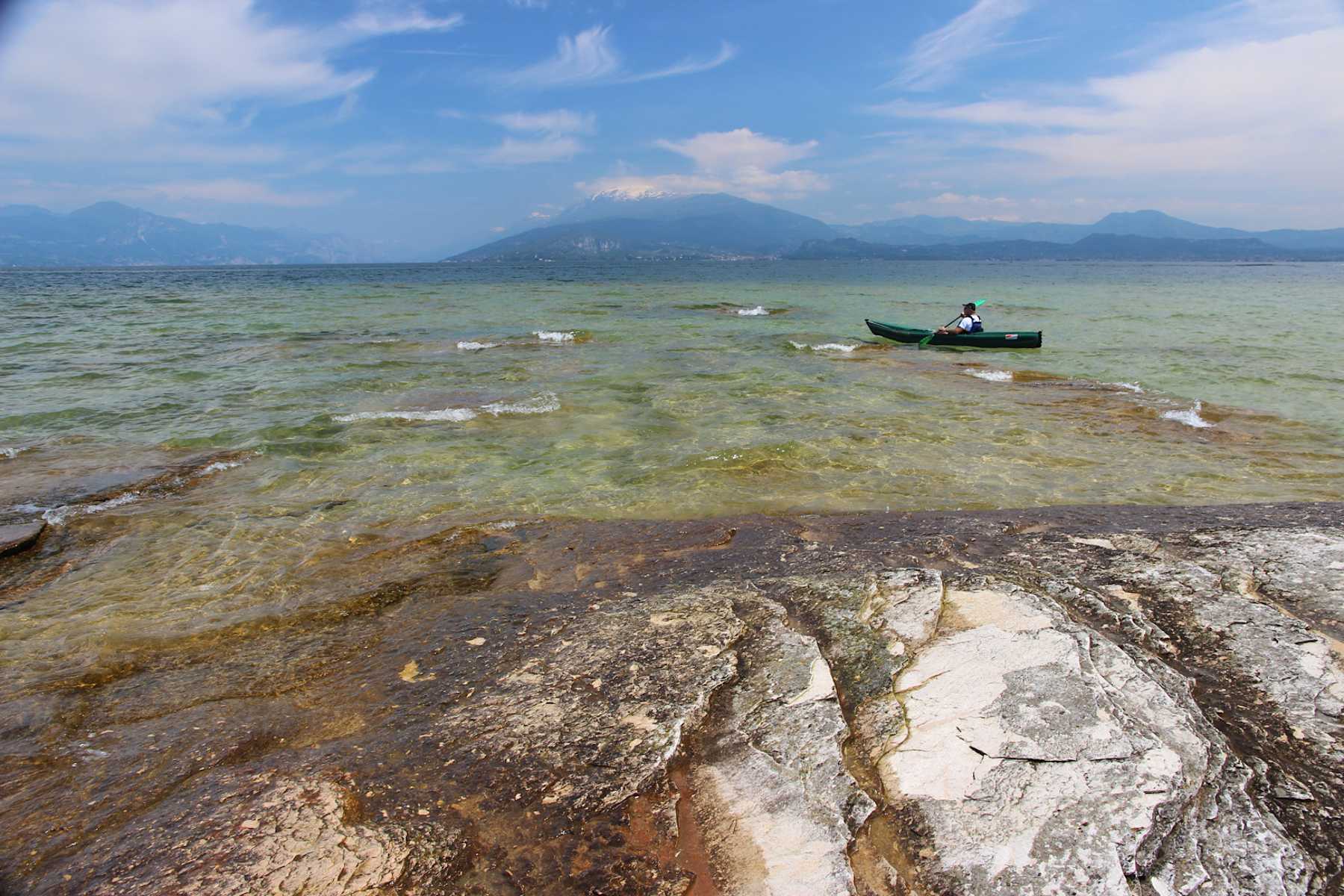 Leichte Kanutour am südlichen Gardasee in Oberitalien entlang der nadelförmigen Halbinsel mit der liebevoll herausgeputzten Altstadt von Sirmione.