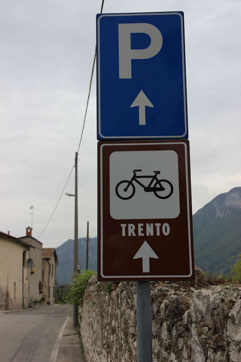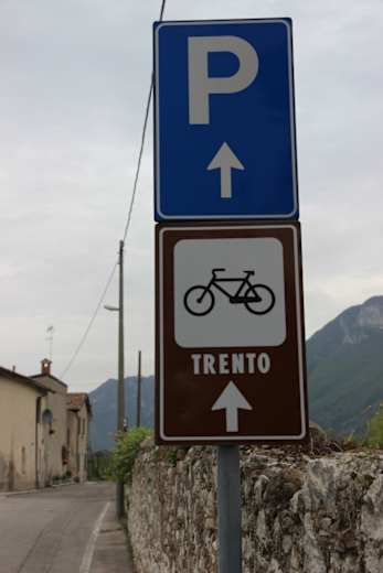 Zurück zum PKW gelangt man auf dem begleitenden Radweg Verona-Trento (das Fahrrad vor der Tour am Endpunkt deponieren). Vom Ausstieg ca. 50 Meter in südliche Richtung, dann immer bergauf mit bis zu 10% Steigung bis Rivoli Veronese. Durch den Ort auf der Straße, dann wieder auf dem Radweg, teilweise 10% Gefälle bis zur mäßig befahrenen Straße Strada Provinziale 11, auf dieser bis zum Einstieg.