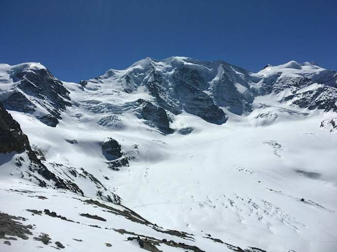 Vom Ostgipfel steigt man kurz ab und gelangt über einen exponierten Grat mit Absturzgefahr zum Hauptgipfel auf 3.900 m. Je nach Schneelage Abfahrt mit den Skiern oder zu Fuss bis kurz vor den Piz Spinas. Der Übergang auf den Fellaria Gletscher kann etwas hackelig sein. Je nach Verhältnissen mit Ski abfahren, zu Fuss gehen oder abseilen.