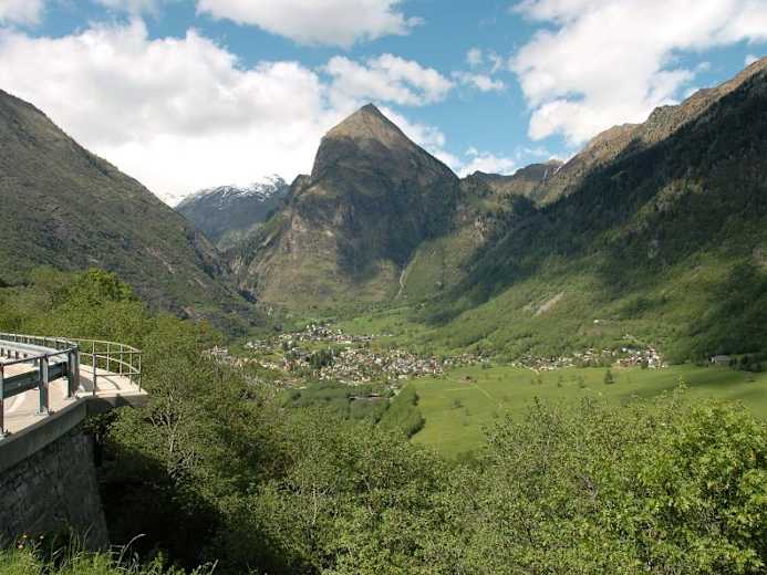 In Olivone muss man die wunderbare Landschaft geniessen und dem einen Arm des Brenno zusehen, wie er durch das Valle Santa Maria strömt.