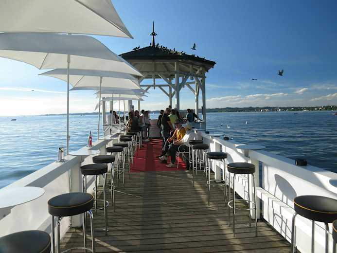 Wenige hundert Meter nach der Seebühne fällt ein hölzerner Pavillon ins Auge, in dem sich die szenische Sunset Bar befindet. Allerdings kann man im unmittelbaren Nahbereich nicht anlanden. Hier ist der Wendepunkt.