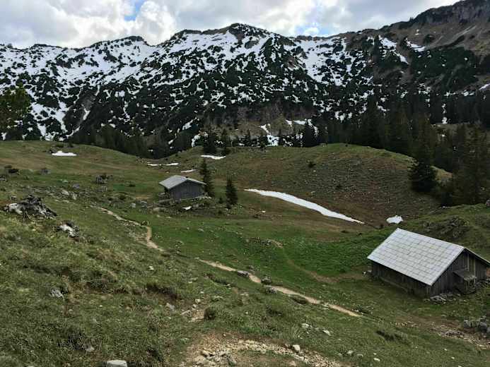 Der Abstieg erfolgt über die Vilser Alm. Kurz vor Erreichen der Alm zweigt man ab und folgt dem Weg über das Karre Jöchle zum Skigebiet Füssener Jöchle.