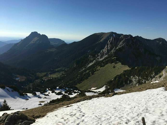 Vom Ausgangspunkt geht es über die Bad Kissinger Hütte (1.788 m) direkt zum Gipfel des Aggenstein (1.985 m). Abstieg Richtung Breitenberg und Hochalphaus.