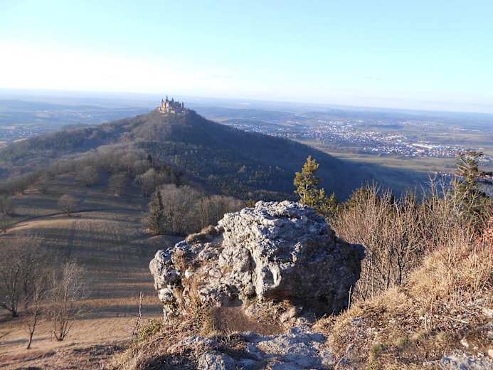 Nun wartet auch schon das Zellerhorn, ein beliebtes Ausflugsziel auf der Schwäbischen Alb mit einem atemberaubenden Blick auf die Burg Hohenzollern. Der Weg führt weiter am Albtrauf entlang bis zum Zitterhof wo, man einen Downhill zurück nach Pfeiffingen hinunter läuft.