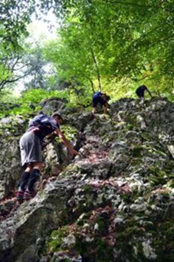Am Urselbach vorbei geht es weiter zum Lindenberg und von dort über 100% Trail zur legendären Bärenhöhle (hier lohnt es sich hineinzuschauen, denn dort wohnt eine Teddybären-Familie und wer möchte, kann die Felsen hinauf- und hinabklettern).