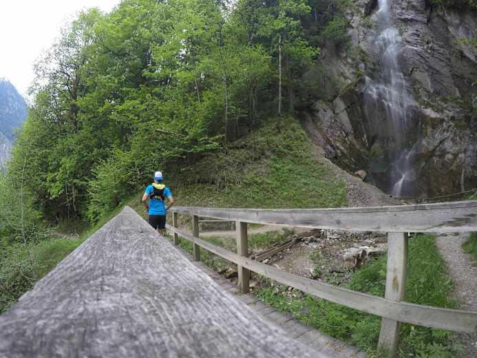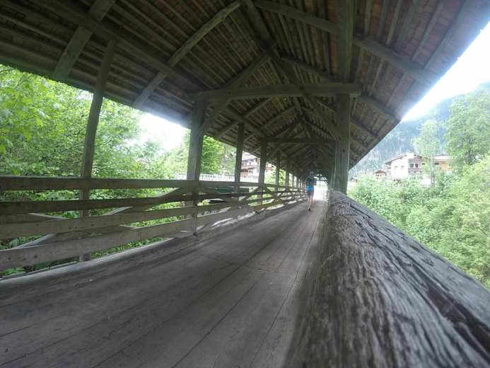 Nach dem Lauf lohnt ein kurzer Stop beim sagenumwobenen Teufelssteg. Die gedeckte Holzbrücke über die Klamm des Tuxerbaches wurde bereits 1876 erbaut und steht unter Denkmalschutz. Einer Sage zufolge hat der Teufel das Leben des ersten Wesen gefordert, welches die Brücke queren würde. Ein schlauer Bauer trickste ihn aus und trieb als erstes einen Ziegenbock über den Steg.