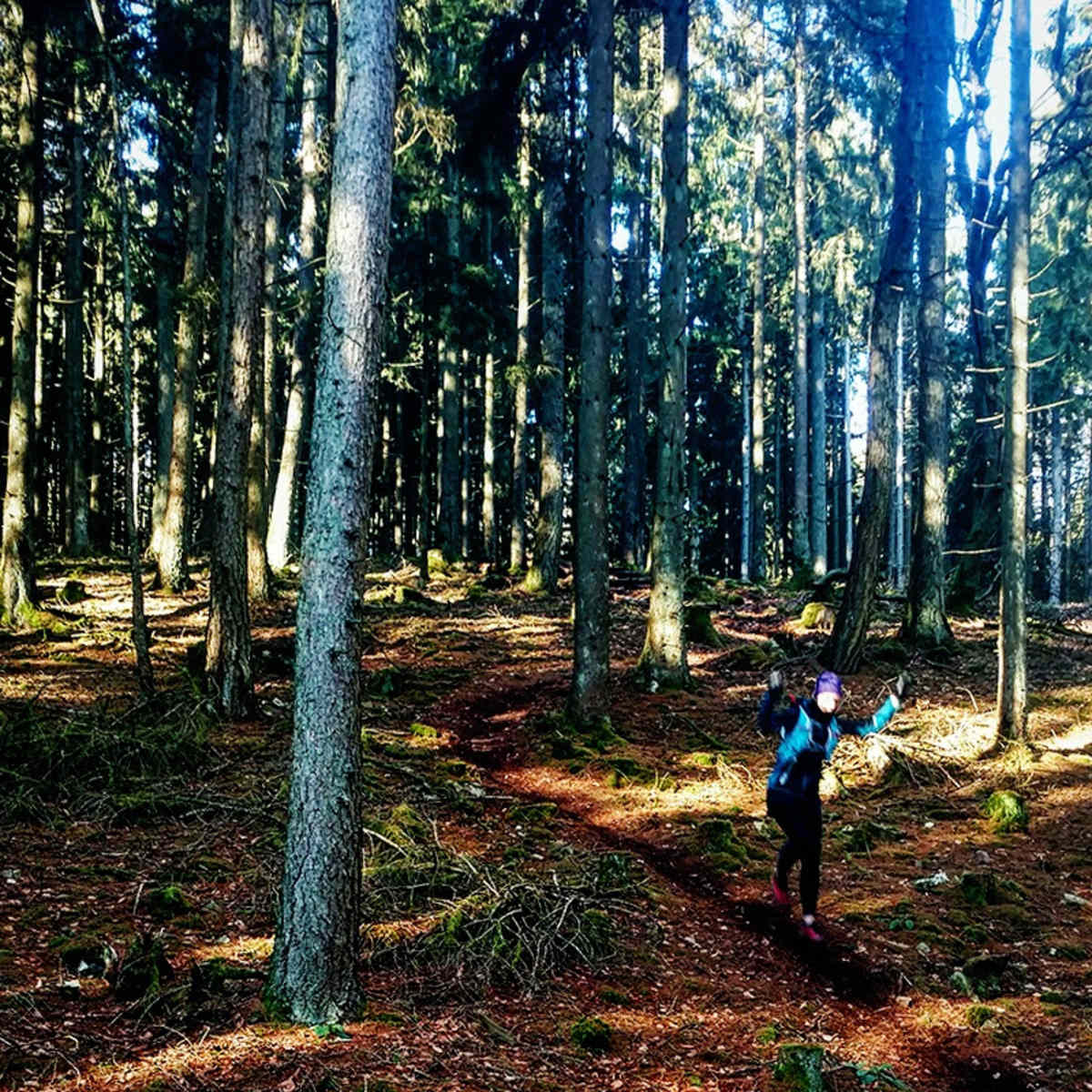Die Tour führt über Schotter in den Wald hinein. Recht bald kommt eine Passage, an der man einen Hang hinaufsteigt, um auf den nächsten Pfad zu gelangen. Dort angekommen, folgt man gut laufbaren Wegen und Trails, bis man sich auf einem wunderschönen Singletrail wiederfindet, welcher fast bis hoch zum Sandplacken gekurvt werden kann.